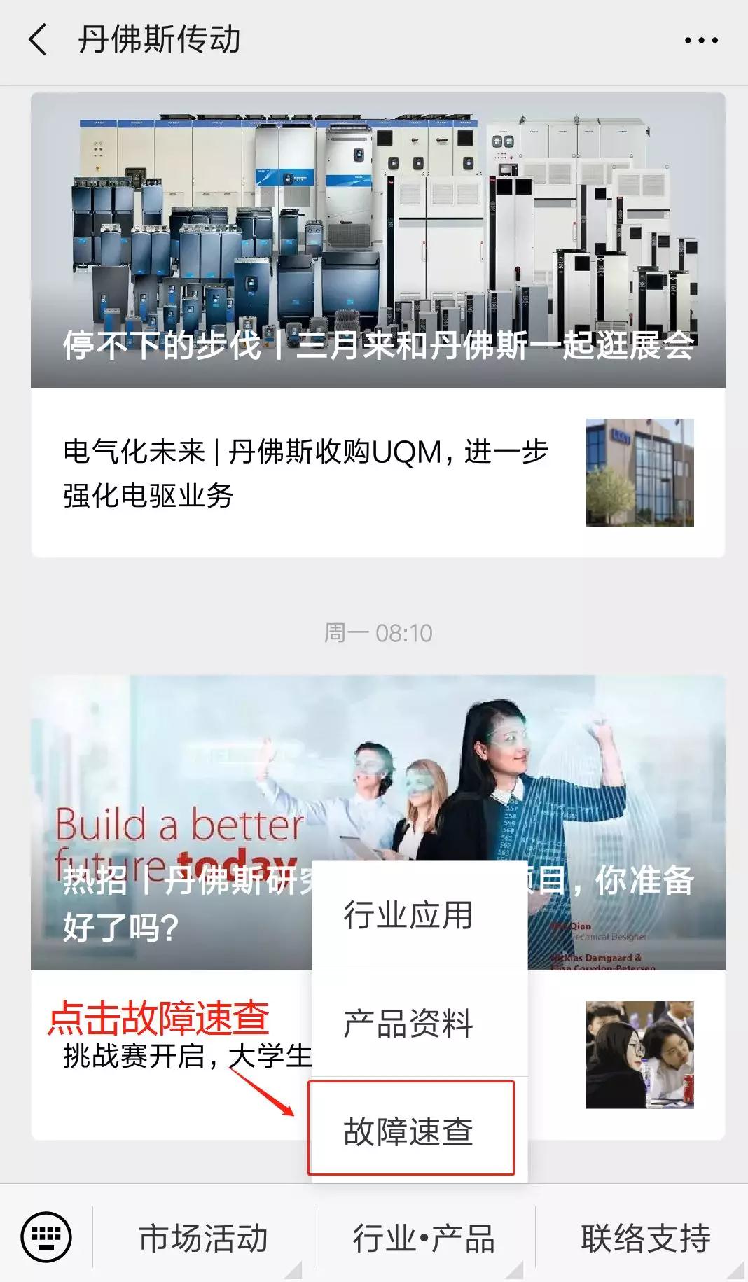 1.在丹佛斯傳動公眾號菜單欄,點擊【行業·產品】,選擇“故障速查”,即可進入故障速查首頁。