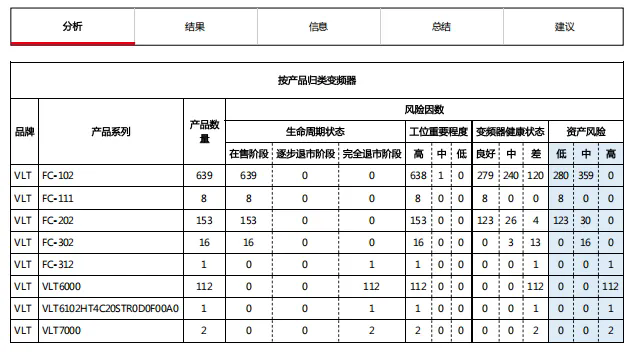 丹佛斯工程師帶領(lǐng)團(tuán)隊(duì),現(xiàn)場推進(jìn)評(píng)估工作。依據(jù)現(xiàn)場評(píng)估所獲取的數(shù)據(jù)信息可知,當(dāng)前該熱力公司在用的變頻器以丹佛斯FC102和FC202機(jī)型為主,有少量FC302和FC111機(jī)型,其中112臺(tái)已退市的VLT6000機(jī)型仍在使用,445臺(tái)變頻器已使用超過10年,253臺(tái)變頻器健康狀態(tài)較差。此次現(xiàn)場評(píng)估工作從變頻器健康狀態(tài)、生命周期、工位重要程度三個(gè)維度進(jìn)行了分析,幫助客戶梳理變頻器臺(tái)賬,排查故障,為后續(xù)的設(shè)備維保改造與預(yù)算制定計(jì)劃提供了依據(jù)。
