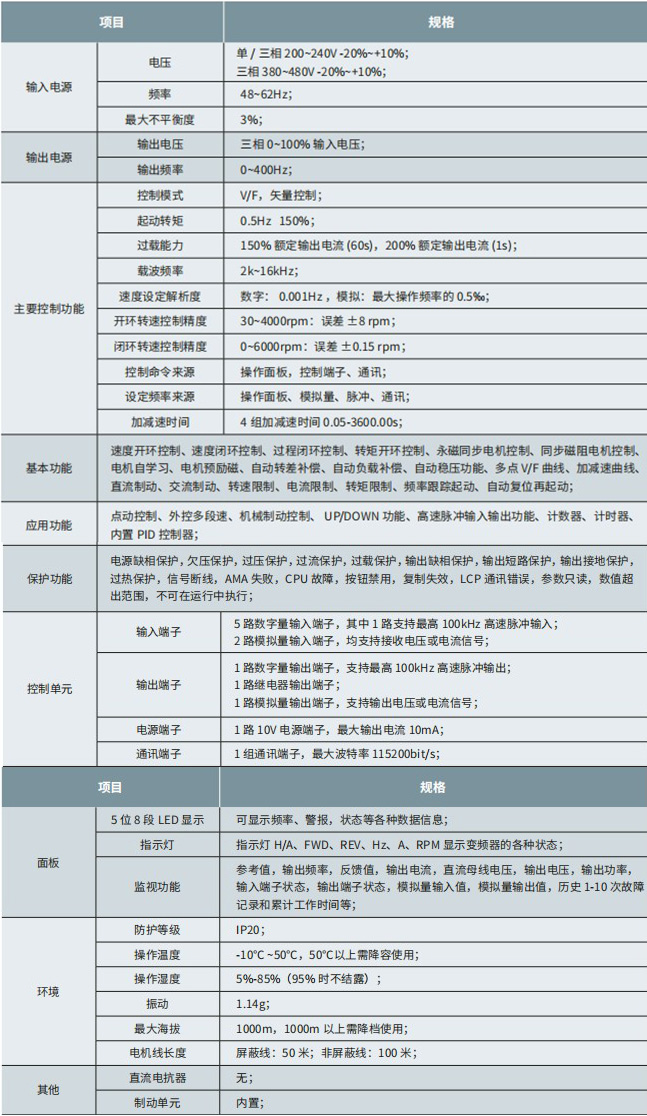 速度開環控制、速度閉環控制、過程閉環控制、轉矩開環控制、永磁同步電機控制、同步磁組電機控制、電機自學習、電機預勵磁、自動轉差補償、自動負載補償、自動穩壓功能、多點V/F曲線、加減速曲線、直流制動、交流制動、轉速限制、電流限制、轉矩限制、頻率跟蹤起動、自動復位再起動;