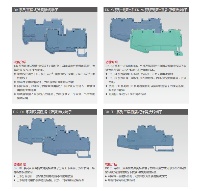 DK系列直插式彈簧接線端子無需任何工具實(shí)現(xiàn)剛性導(dǎo)線的連接,為您節(jié)省50%的安裝時間。