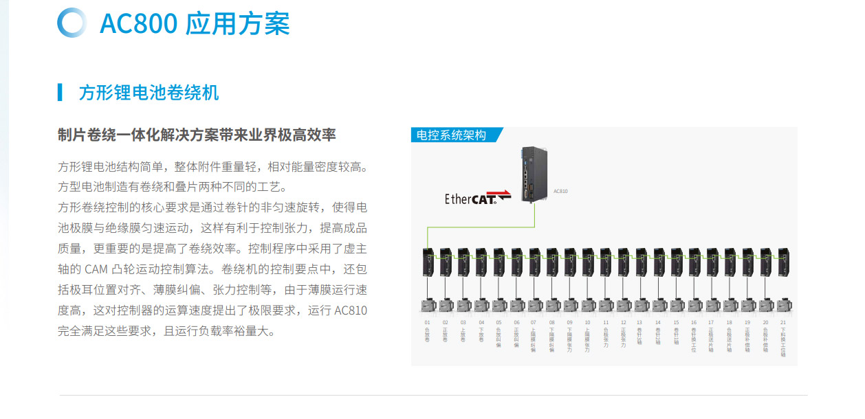 AC800 高性能智能機械控制器,是基于Intel X86 處理器硬件平臺,符合PLCopen 規范的高性能多軸運動控制器,以EtherCAT 為總線,可以實現多軸伺服控制,尤其適用于先進制造業的高速生產裝備和大型設備的控制。