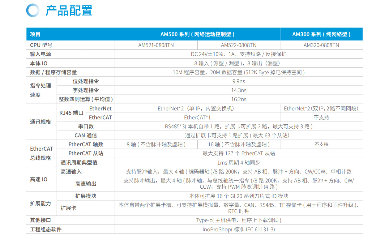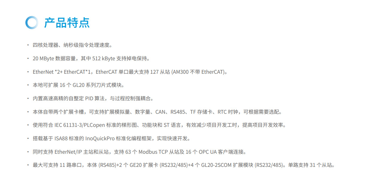 AM300系列是匯川技術推出的新一代中型PLC,其設計開發完全符合PLCopen規范和IEC-61131-3標準,支持ST,LD,SFC,CFC等編程語言,具備高性能、小體積、模塊化等優點。集成如EtherNet/IP、OPC UA、Modbus TCP(支持兩路不同網段的IP地址)、TCP/IP、RS485(最大可擴展至3路)、CAN總線等全球標準工業網絡。主要應用于暖通空調、化工印染、水處理、污水處理、熱處理等過程控制行業,同時可作為物流、汽車、日用品等單機組合產線的網絡通信站點,滿足內外網隔離、高速總線通信及數據處理的場景應用需求。其開發編程平臺InoProShop覆蓋從多軸復雜應用、離散單機應用到基本邏輯應用,可搭載匯川技術基于ISA88標準開發的InoQuickPro標準化編程模板框架,實現規范的標準化管理開發,降低人才培訓成本。