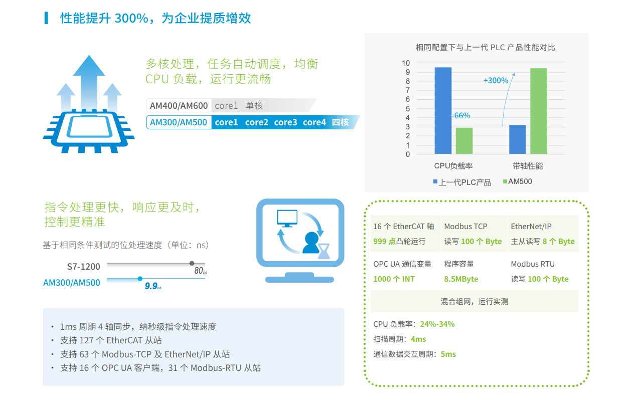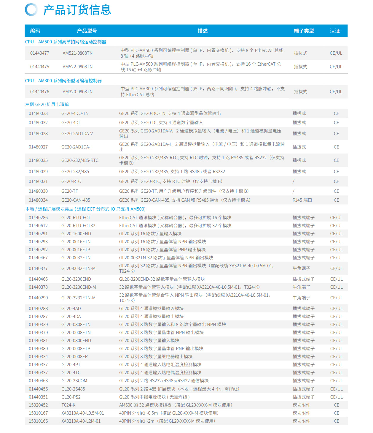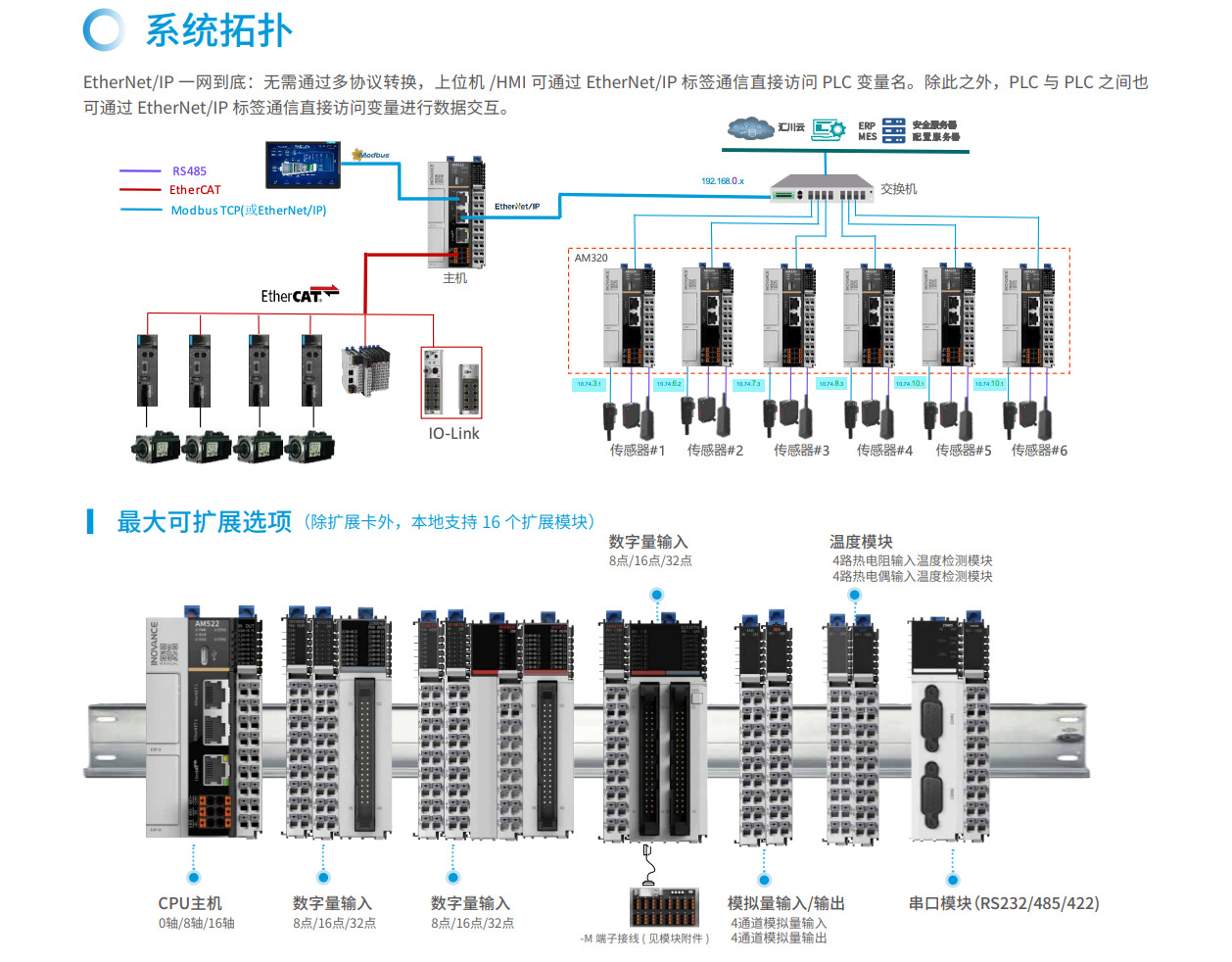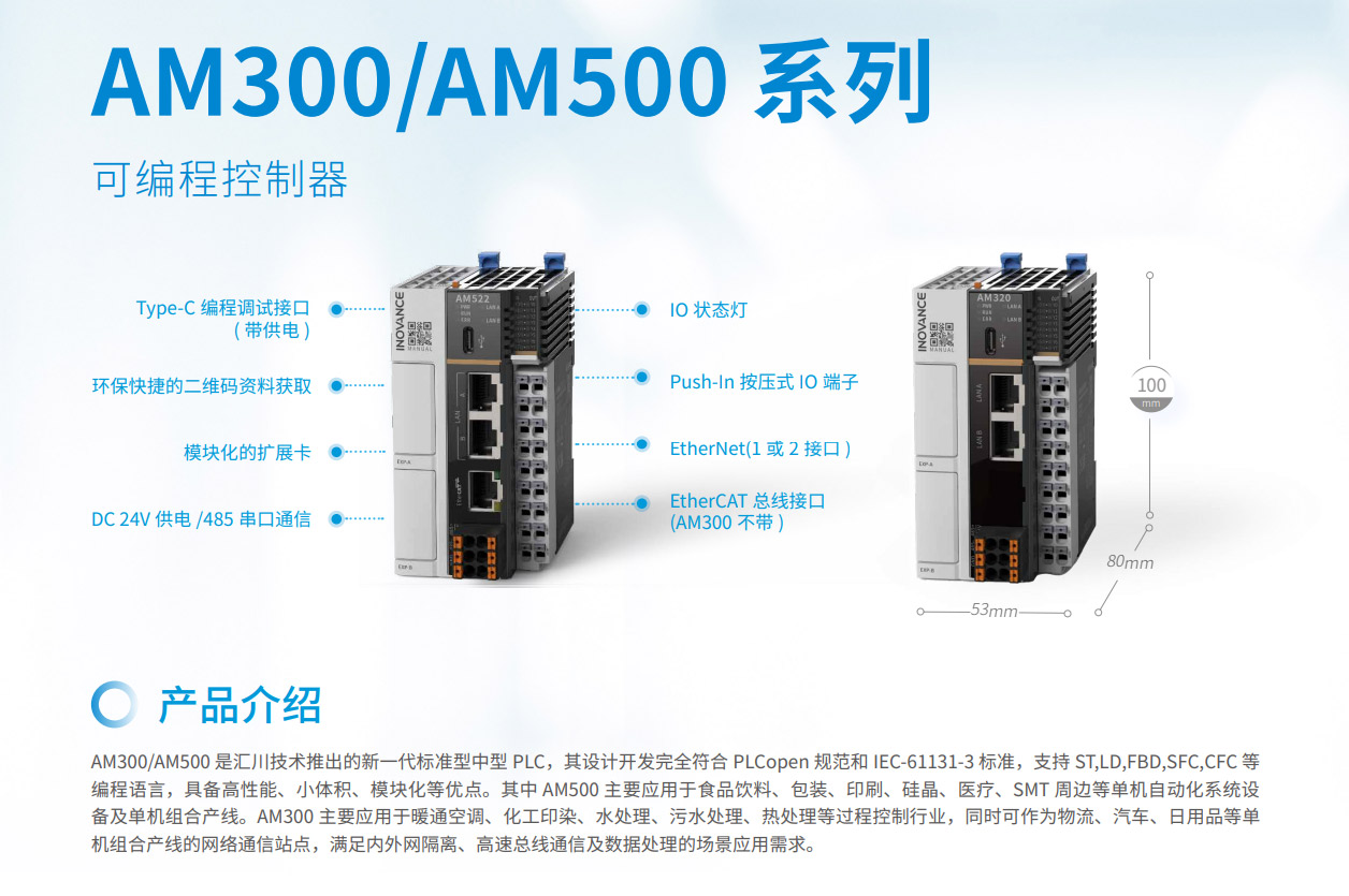 AM300系列是匯川技術推出的新一代中型PLC,其設計開發完全符合PLCopen規范和IEC-61131-3標準,支持ST,LD,SFC,CFC等編程語言,具備高性能、小體積、模塊化等優點。集成如EtherNet/IP、OPC UA、Modbus TCP(支持兩路不同網段的IP地址)、TCP/IP、RS485(最大可擴展至3路)、CAN總線等全球標準工業網絡。主要應用于暖通空調、化工印染、水處理、污水處理、熱處理等過程控制行業,同時可作為物流、汽車、日用品等單機組合產線的網絡通信站點,滿足內外網隔離、高速總線通信及數據處理的場景應用需求。