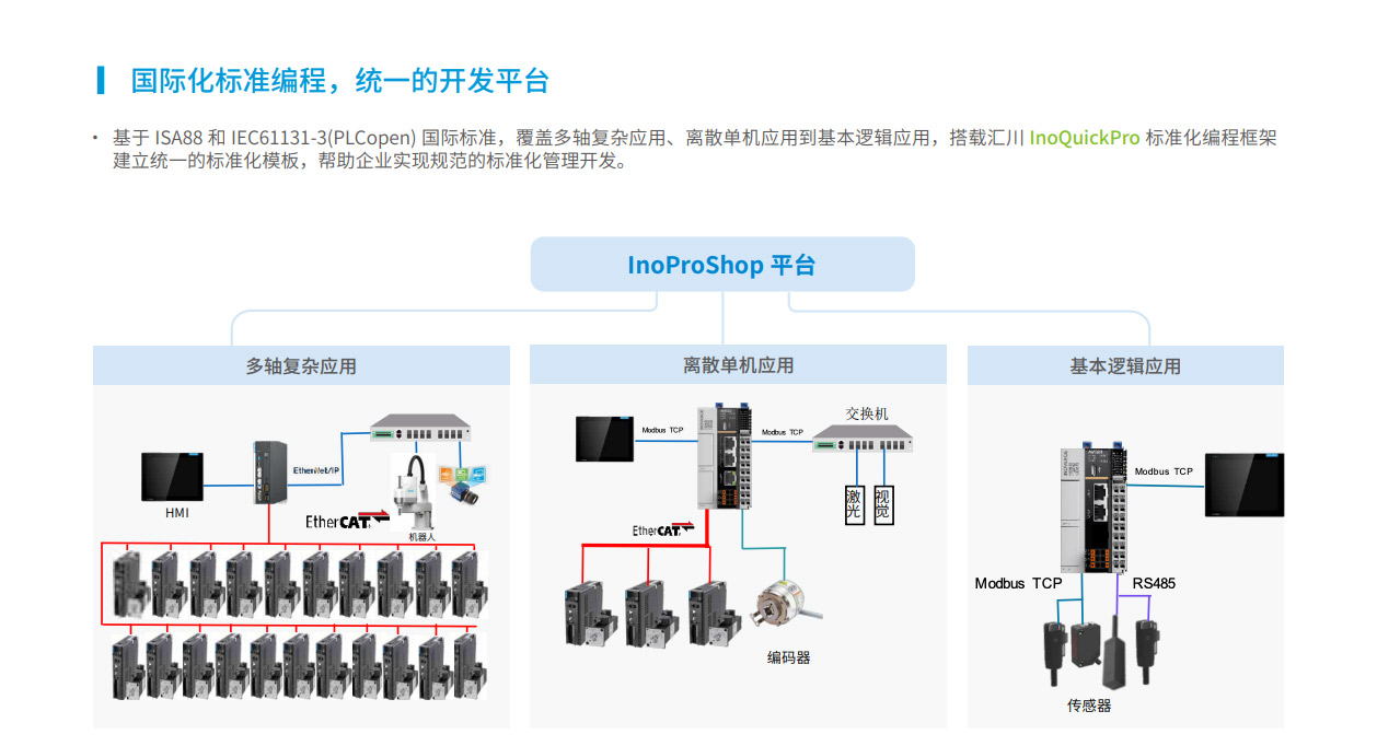 AM500系列是匯川技術推出的新一代標準型中型PLC,其設計開發完全符合PLCopen規范和IEC-61131-3標準,支持ST,LD,SFC,CFC等編程語言,以其小巧的CPU體積、模塊化靈活組合及高節拍生產特性可適應更多的應用場景。支持EtherCAT、EtherNet/IP、OPC UA、Modbus TCP(支持兩路同一網段的IP地址)、TCP/IP、RS485(最大可擴展至3路)、CAN總線等全球標準的工業網絡。主要應用于食品飲料、包裝、印刷、硅晶、醫療、SMT周邊等單機自動化設備及單機組合產線,滿足生產效率及控制精度提升場景需求。其開發編程平臺InoProShop覆蓋從多軸復雜應用、離散單機應用到基本邏輯應用,可搭載匯川技術基于ISA88標準開發的InoQuickPro標準化編程模板框架,實現規范的標準化管理開發,降低人才培訓成本。