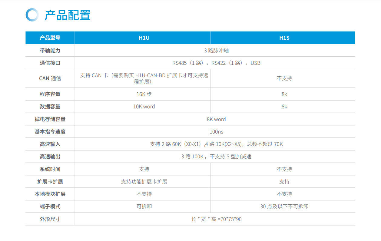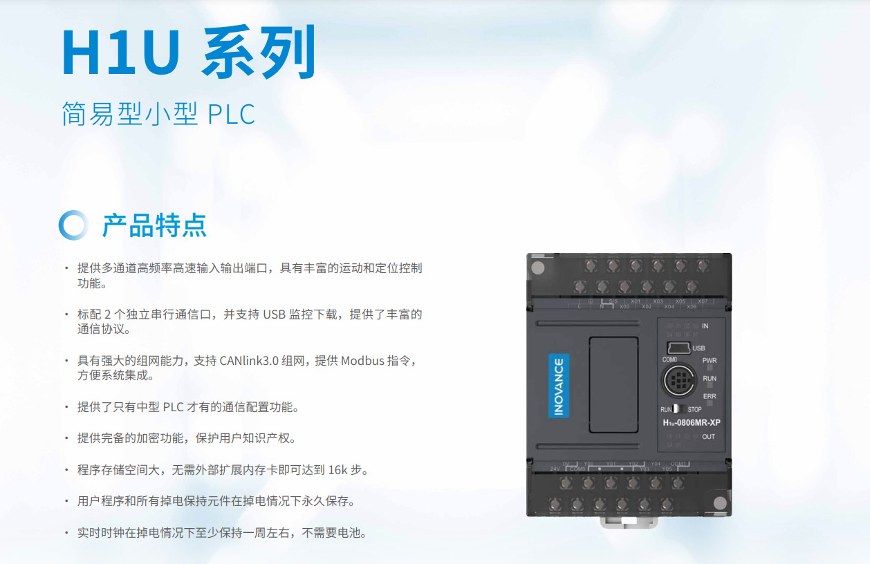 H1U系列PLC 隸屬匯川小型PLC 經濟型系列,其主要特點具備小體積,大程序容量,并具備3 軸高速100K 脈沖以便實現高精度定位。支持CANlink 擴展卡擴展H2u 系列的遠程擴展模塊來豐富IO。該系列PLC 點數覆蓋14~60 點。是小型自動化設備高性價比的選擇。