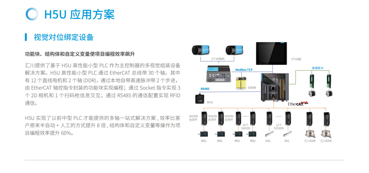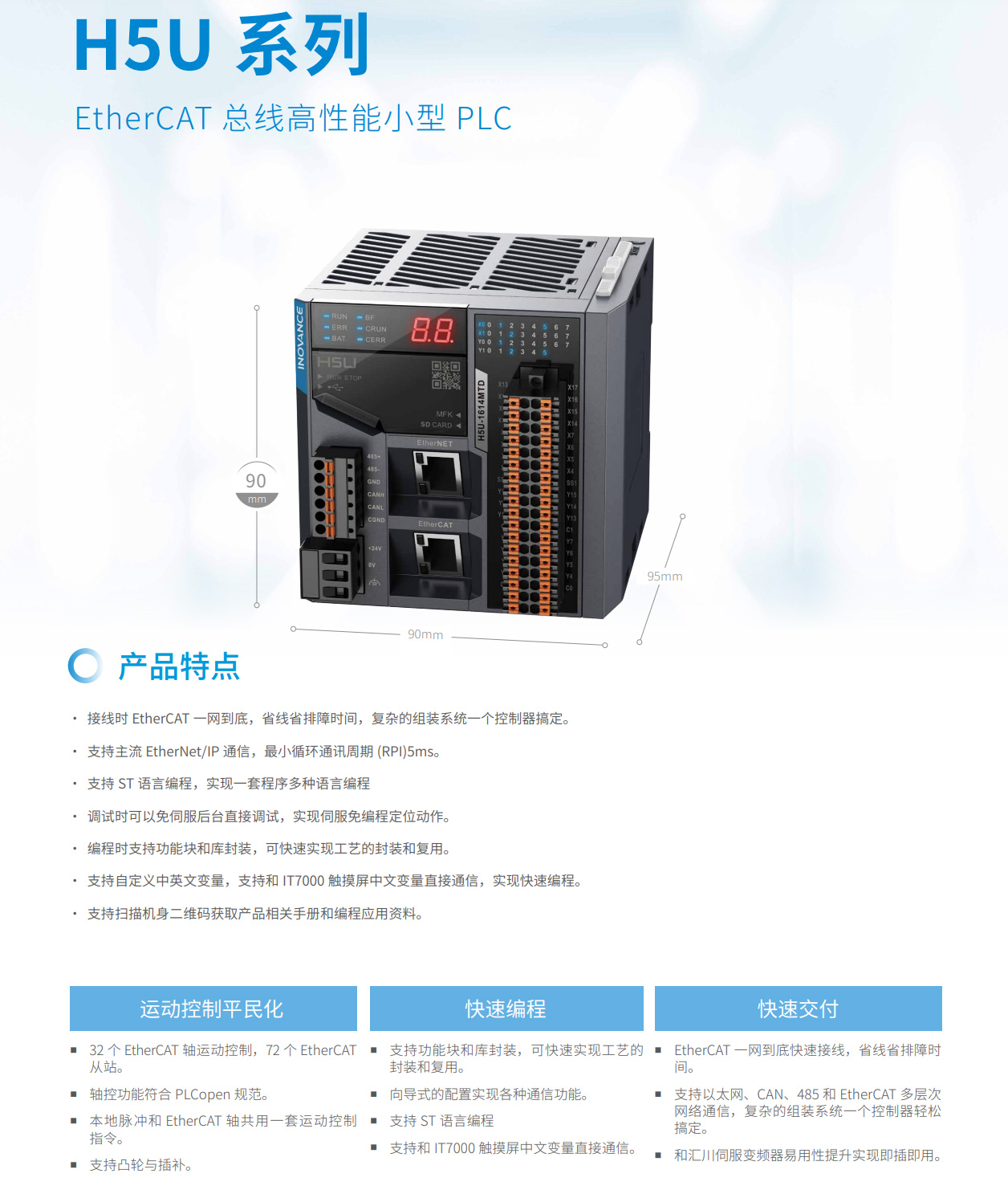 匯川技術推出首個應用EtherCAT 總線的小型PLC H5U,讓線體設備飛速運轉。隨著終端消費日趨升級,生產制造面臨巨大的壓力,而H5U 能夠簡化布線量、加快編程調試時間、滿足帶軸能力的要求以及嚴苛的成本控制需求,從容應對嚴峻的挑戰(zhàn),是將EtherCAT總線應用到小型PLC 的先鋒之作。